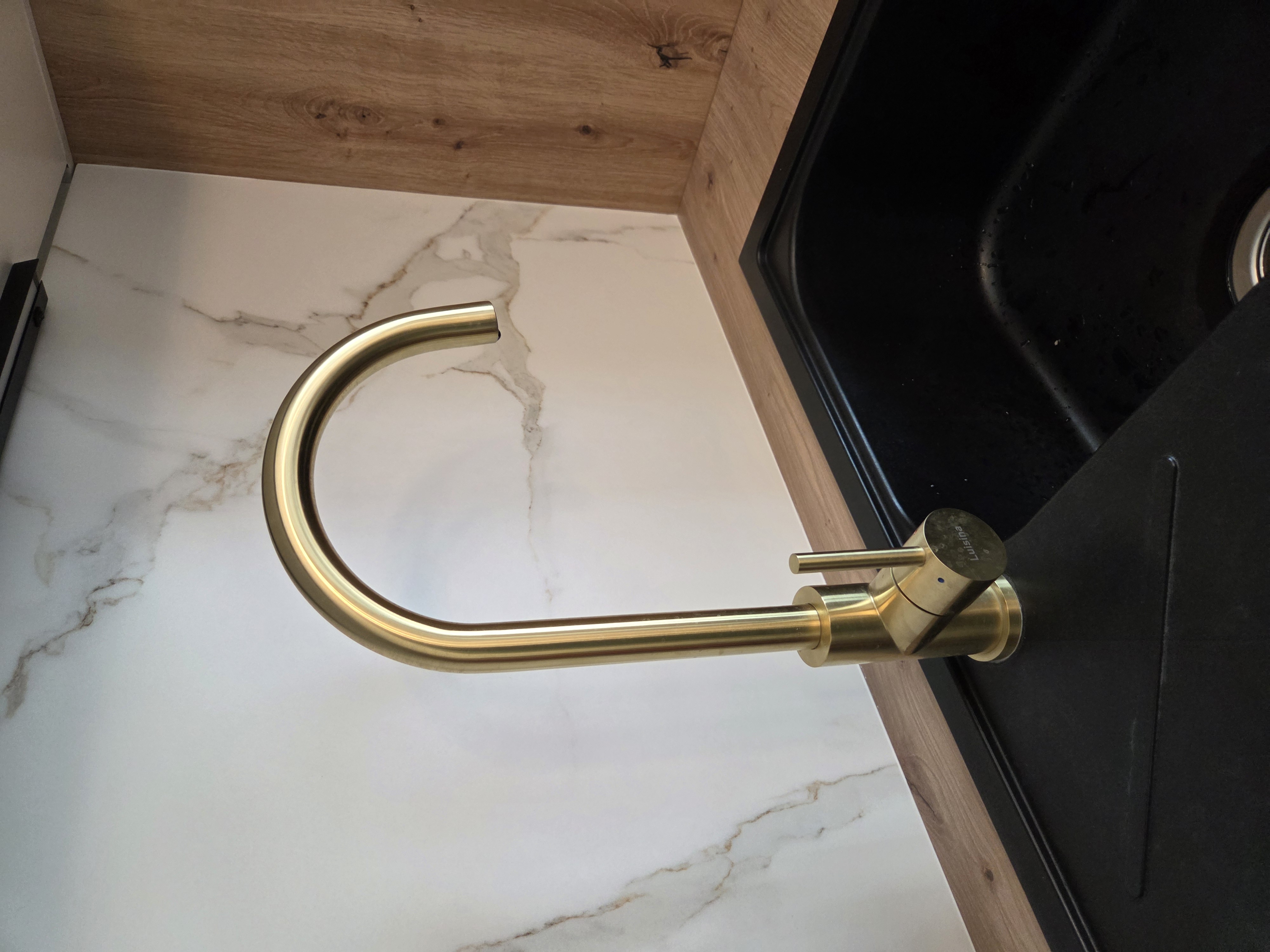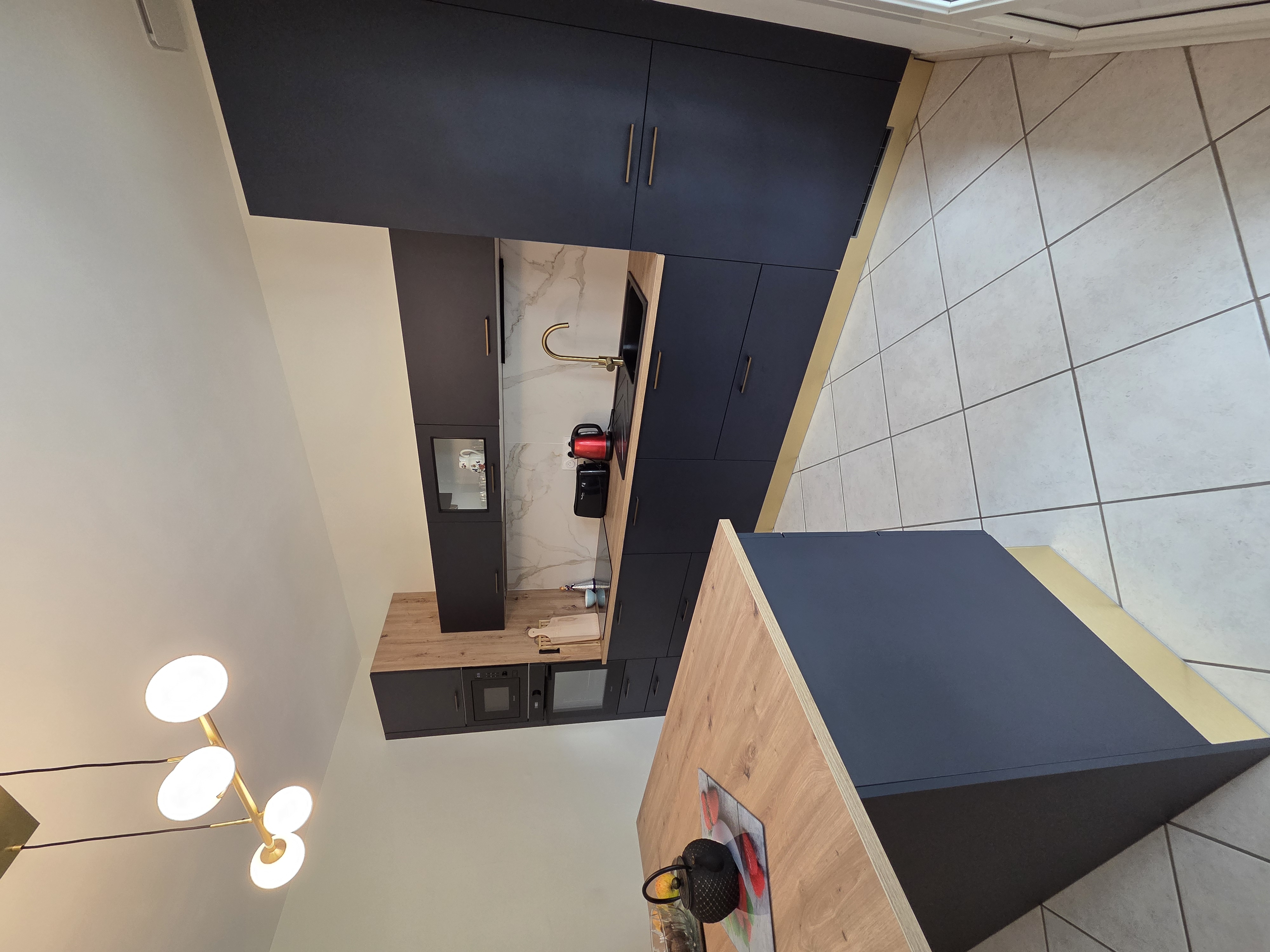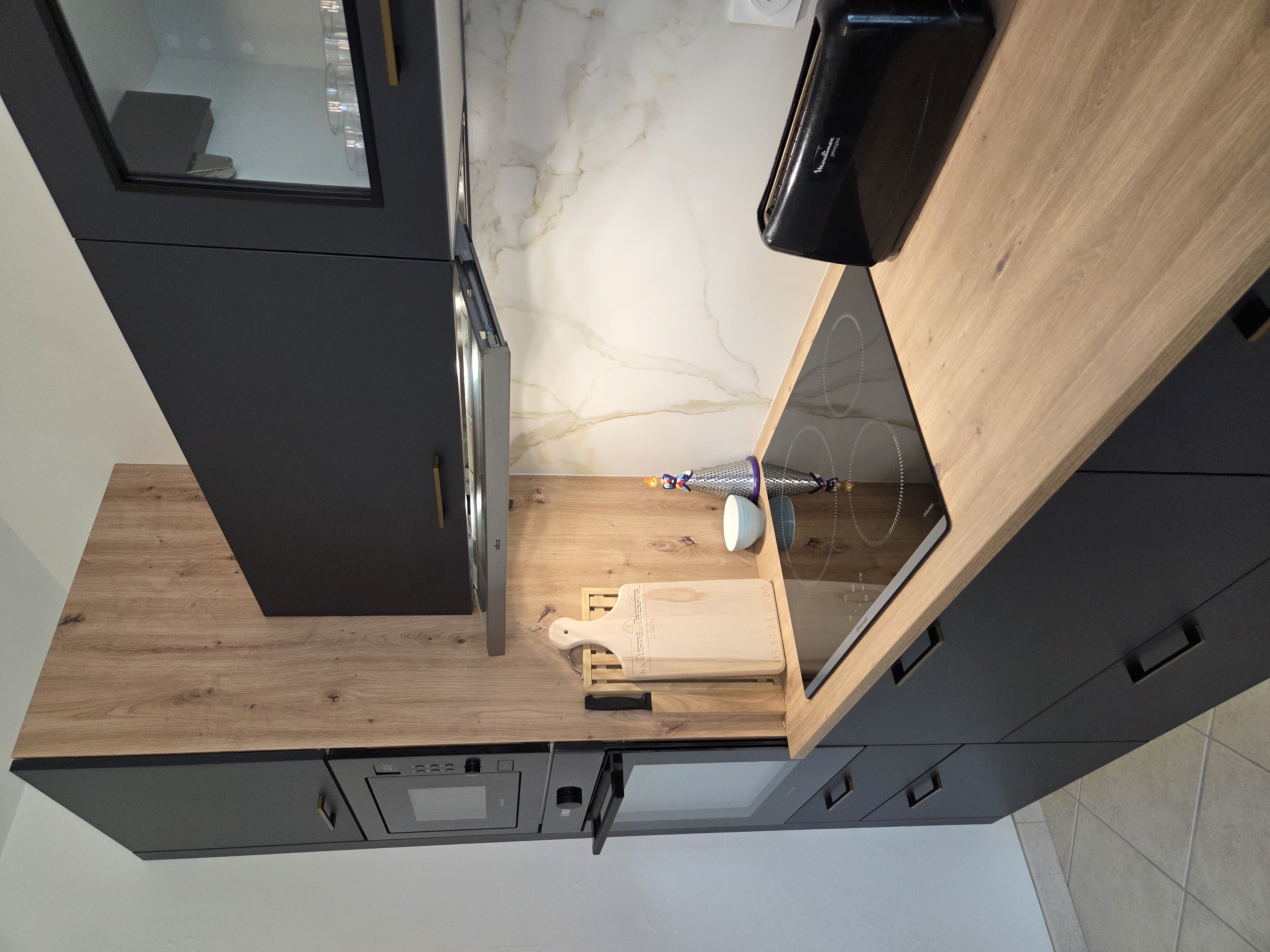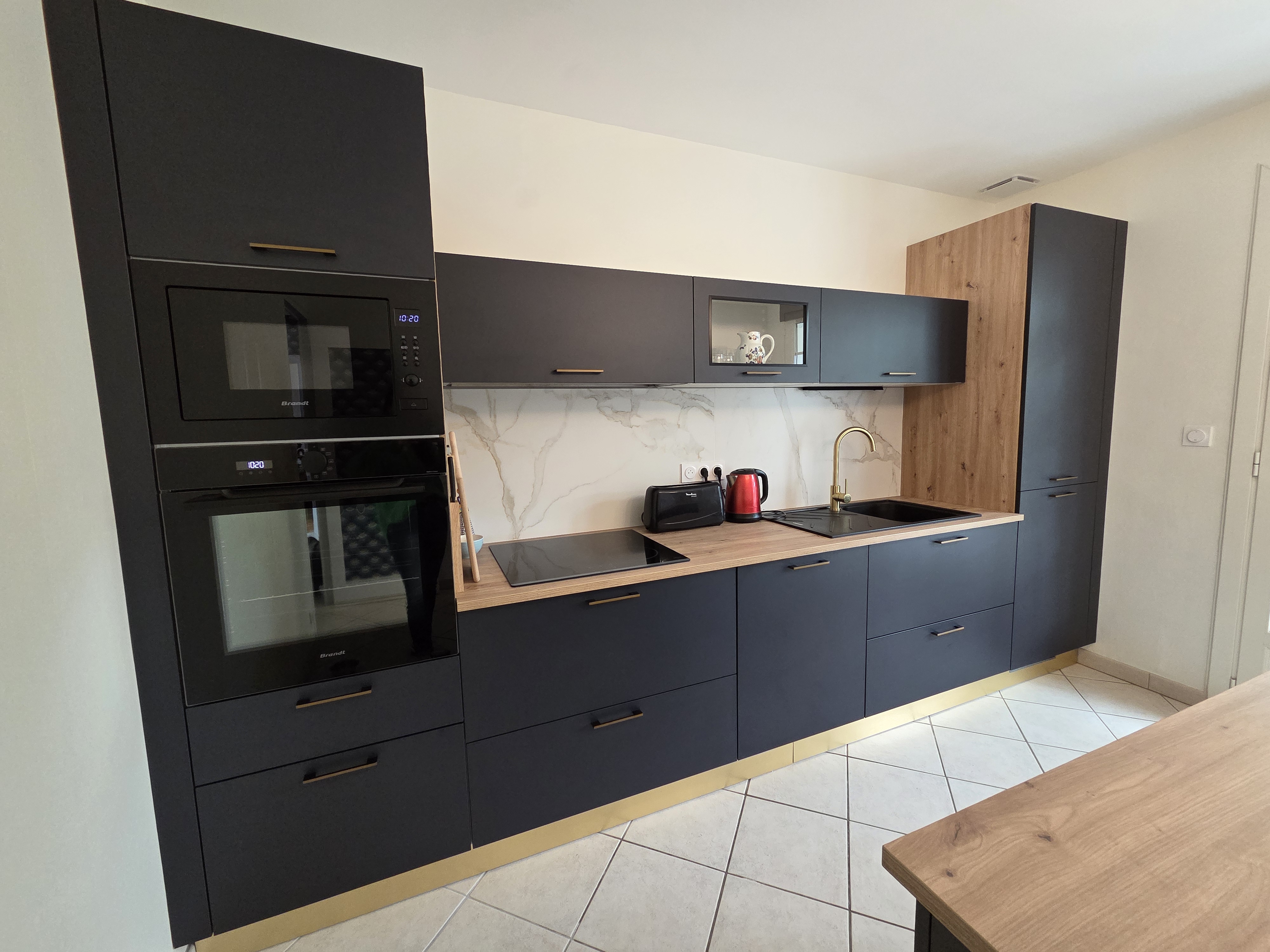 Au mur, la faïence effet marbre sublime l’ensemble avec son raffinement intemporel. Chaque détail a été imaginé pour offrir une atmosphère à la fois contemporaine et accueillante : un lieu où l’on aime cuisiner, recevoir, partager… vivre.