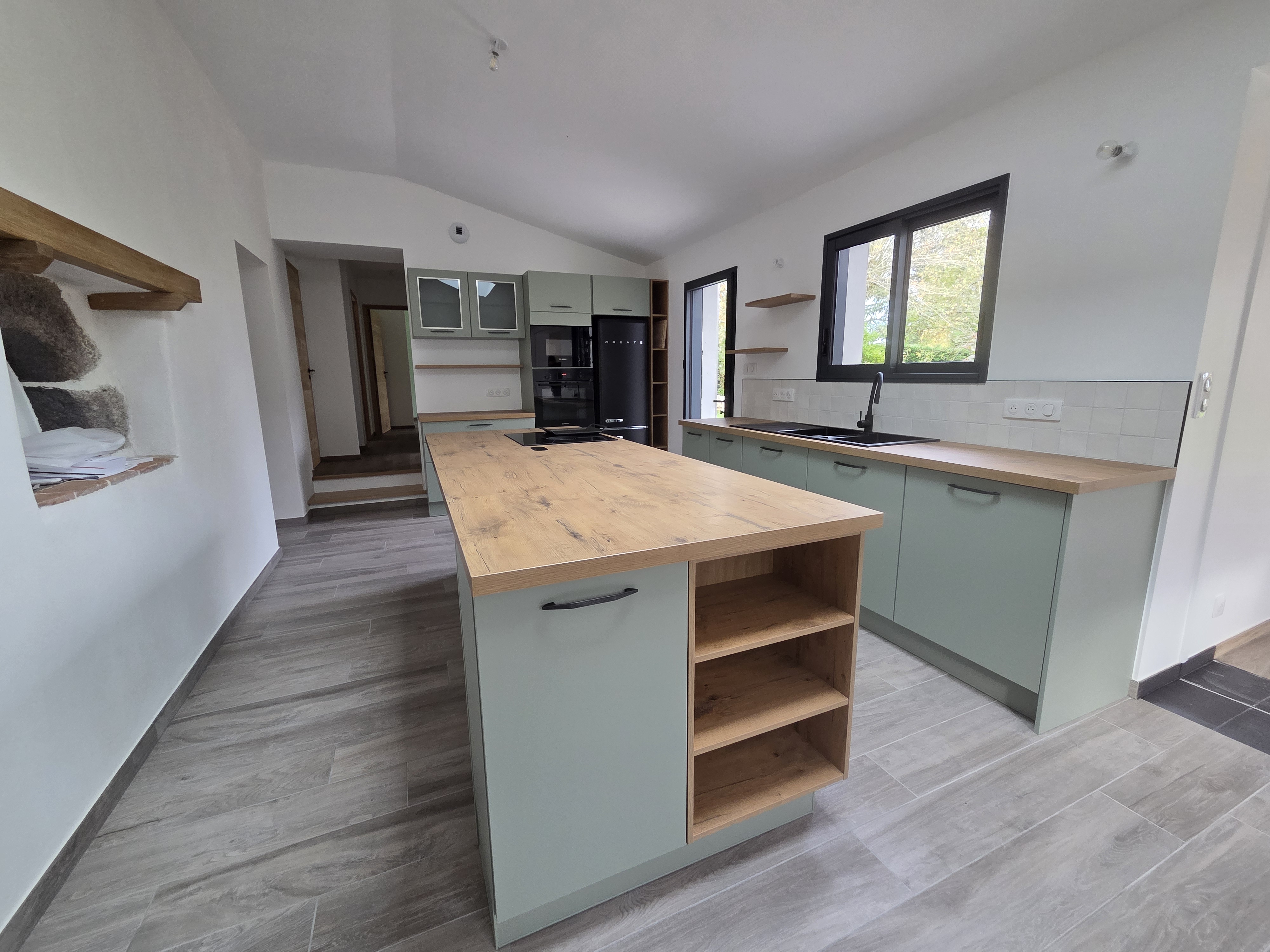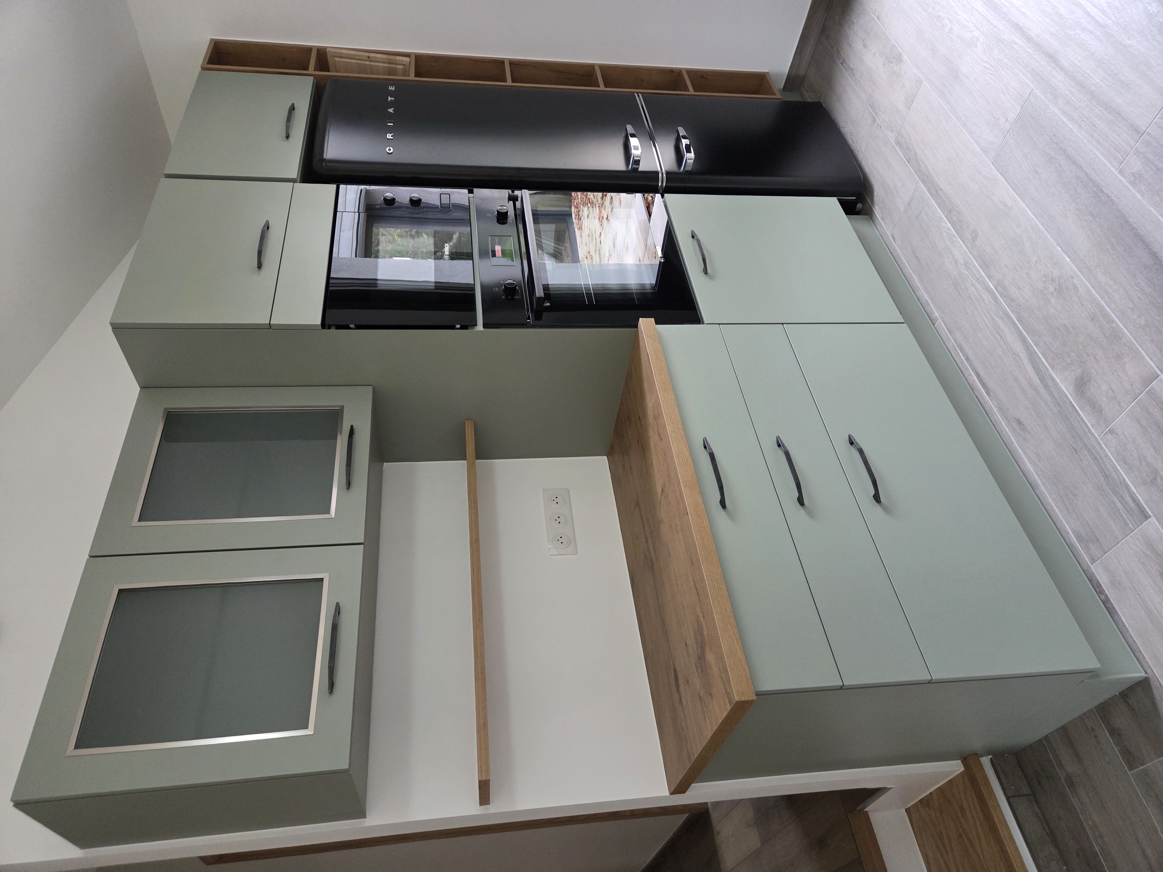 Les clients souhaitaient une cuisine moderne, lumineuse et agréable à vivre. Nous avons choisi un vert sauge doux, un plan de travail en bois chaleureux et ajouté une plaque de cuisson aspirante pour pouvoir cuisiner en toute convivialité, face à l’espace repas. La pièce gagne en fluidité et en confort au quotidien.